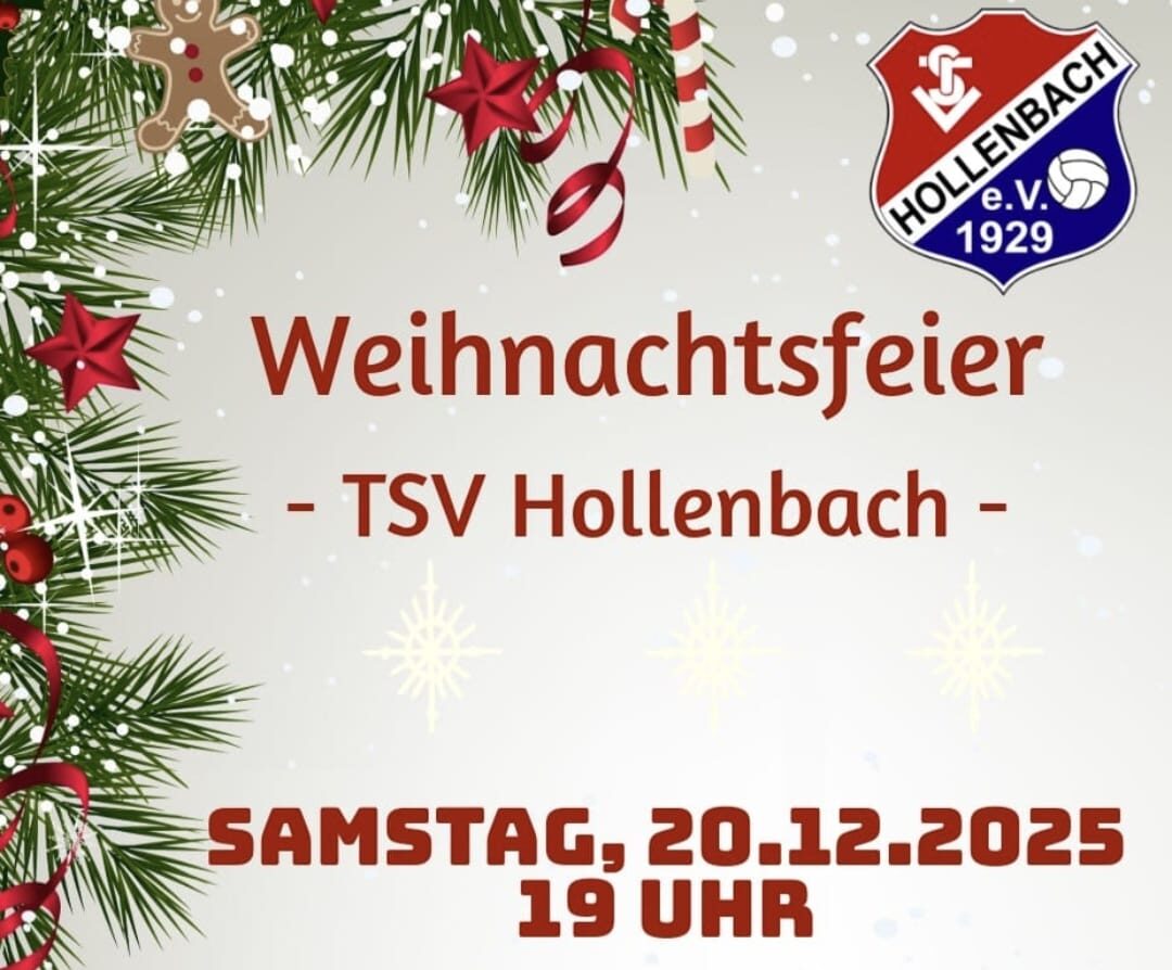 Der TSV Hollenbach lädt alle Spieler und Spielerinnen, Mitglieder, Fans und Gönner zur diesjährigen Weihnachtsfeier am 20. Dezember ein. Wir freuen uns auf eine besinnliche Feier mit euch!
